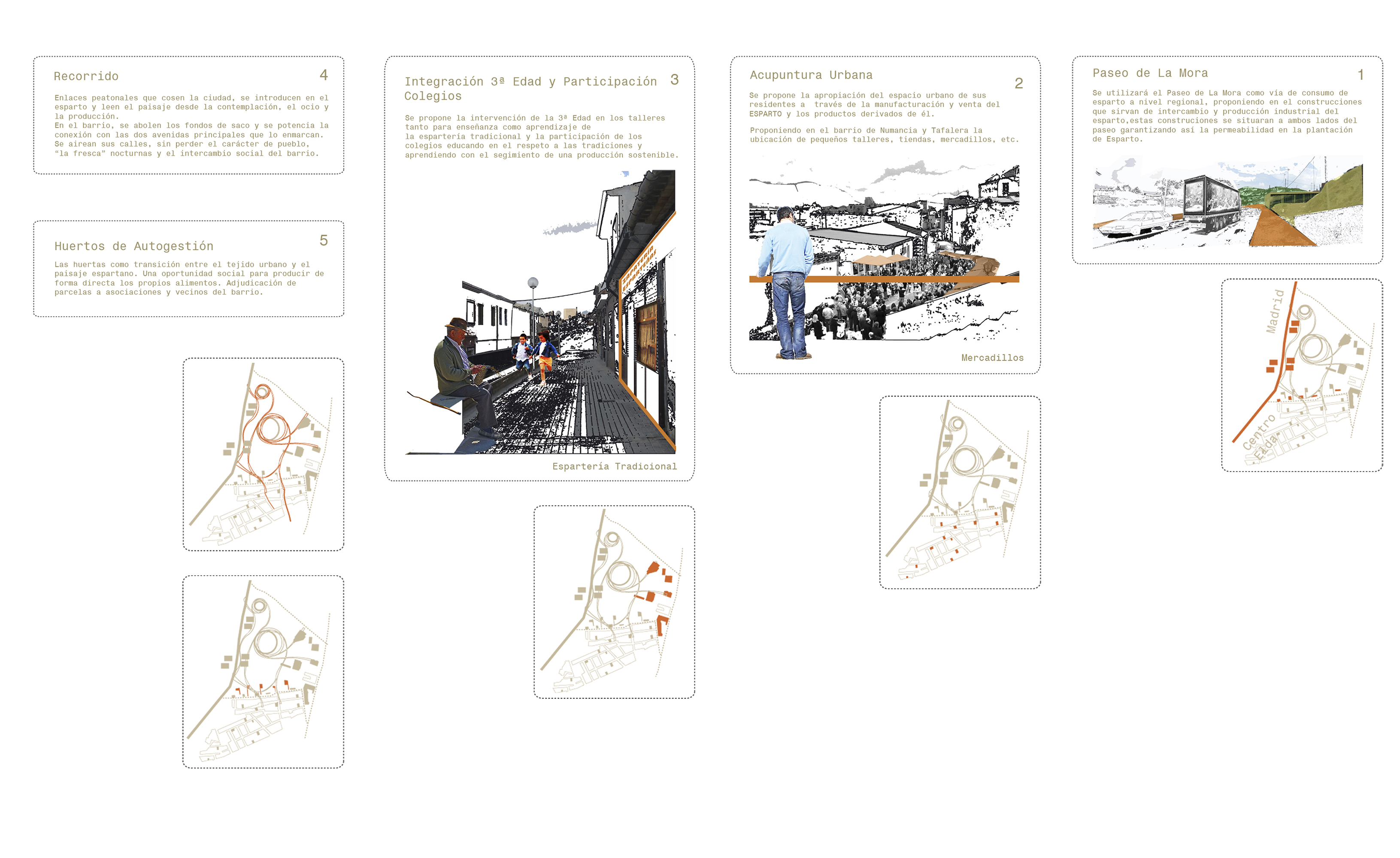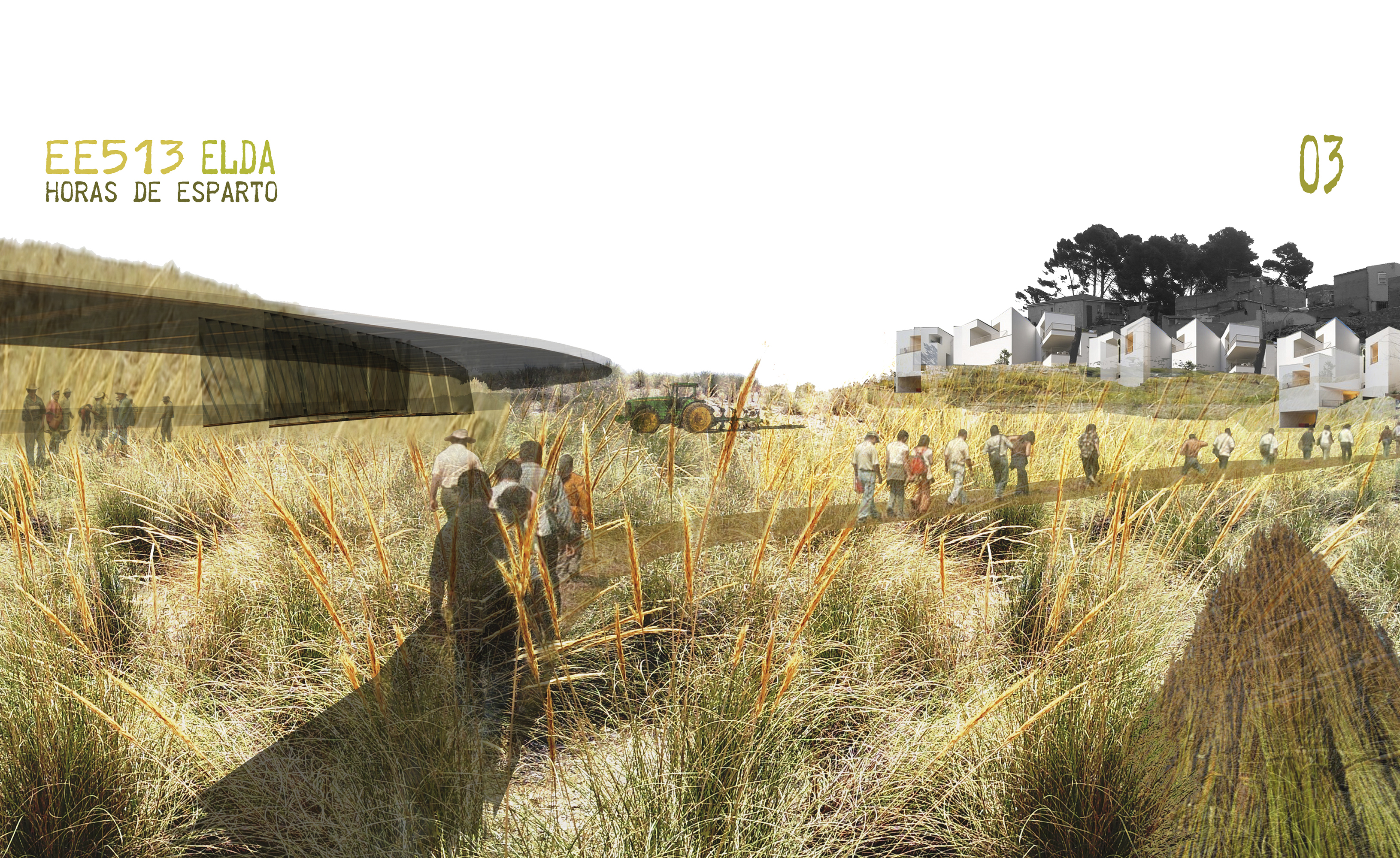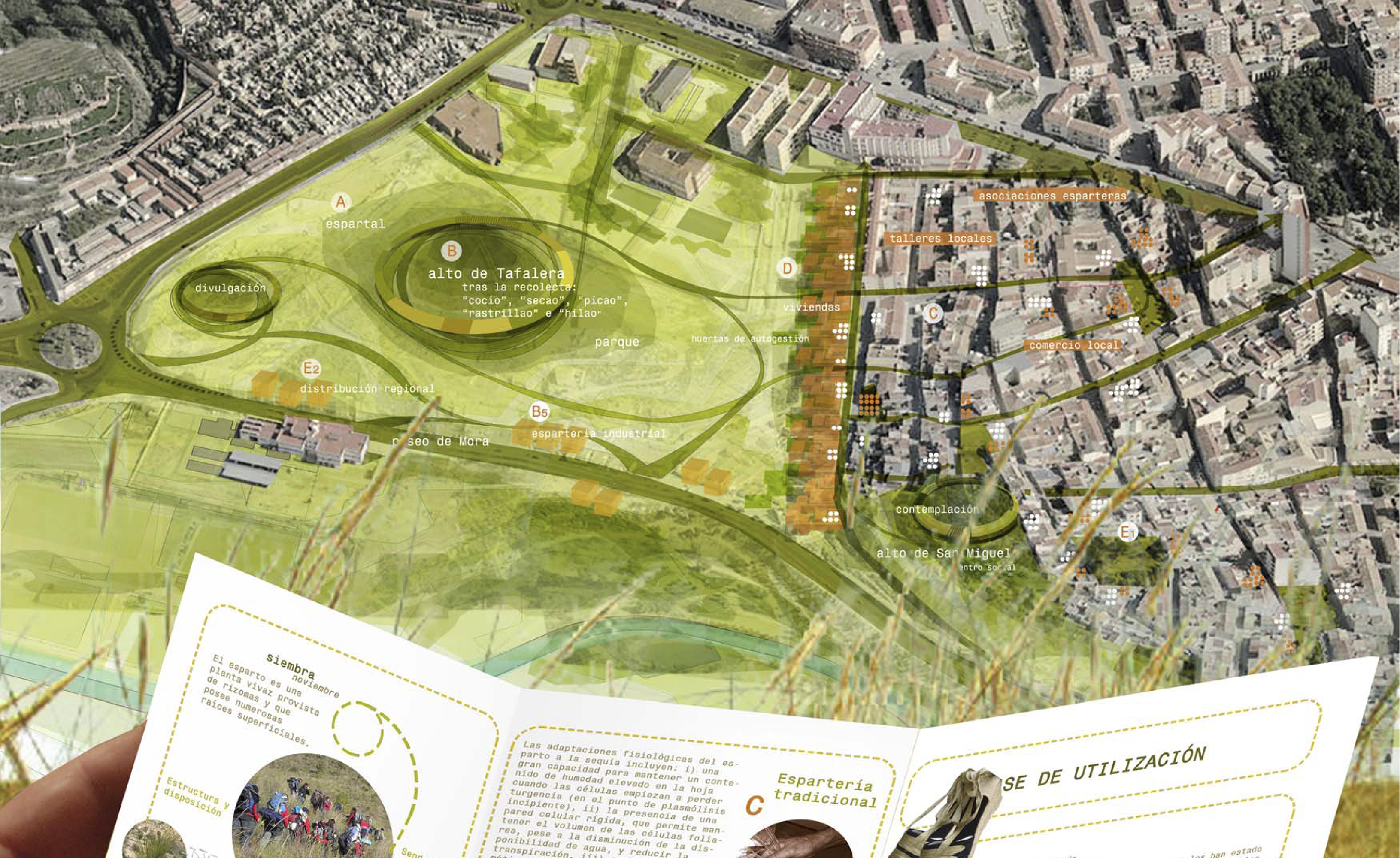 El anillo del alto de Tafalera alberga la manipulación del esparto tras la recolecta. El proceso de transformación del esparto comienza con el cocido y termina con el hilado, pasando por el picado y el rastrillado. La ubicación en el centro del área de cultivo facilita el proceso por su cercanía a la hora de la anterior recolecta y la posterior distribución. Su forma circular refleja la linealidad del proceso y su accesibilidad desde diferentes áreas de cultivo. Forma parte del recorrido de los caminos que entrelazan los diferentes tejidos urbanos alrededor del cultivo, combinando así el aspecto económico, social y educativo del proyecto.