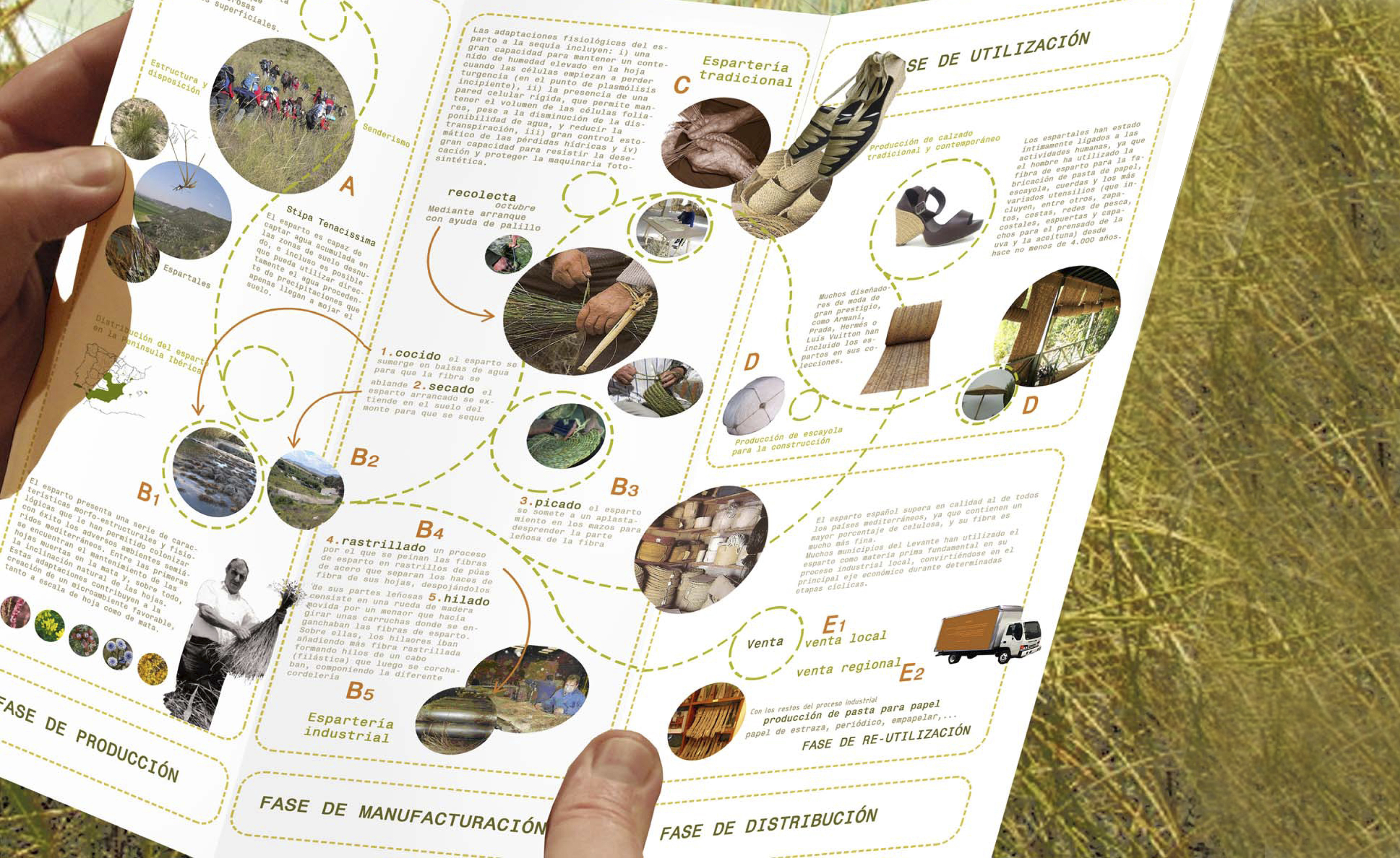 Nuestra propuesta se basa en el cultivo de una especie local: el esparto. Incluye su producción, su preparación para ser elaborado (cocido, secado, picado, rastrillado, hilado), la manufacturación de productos
