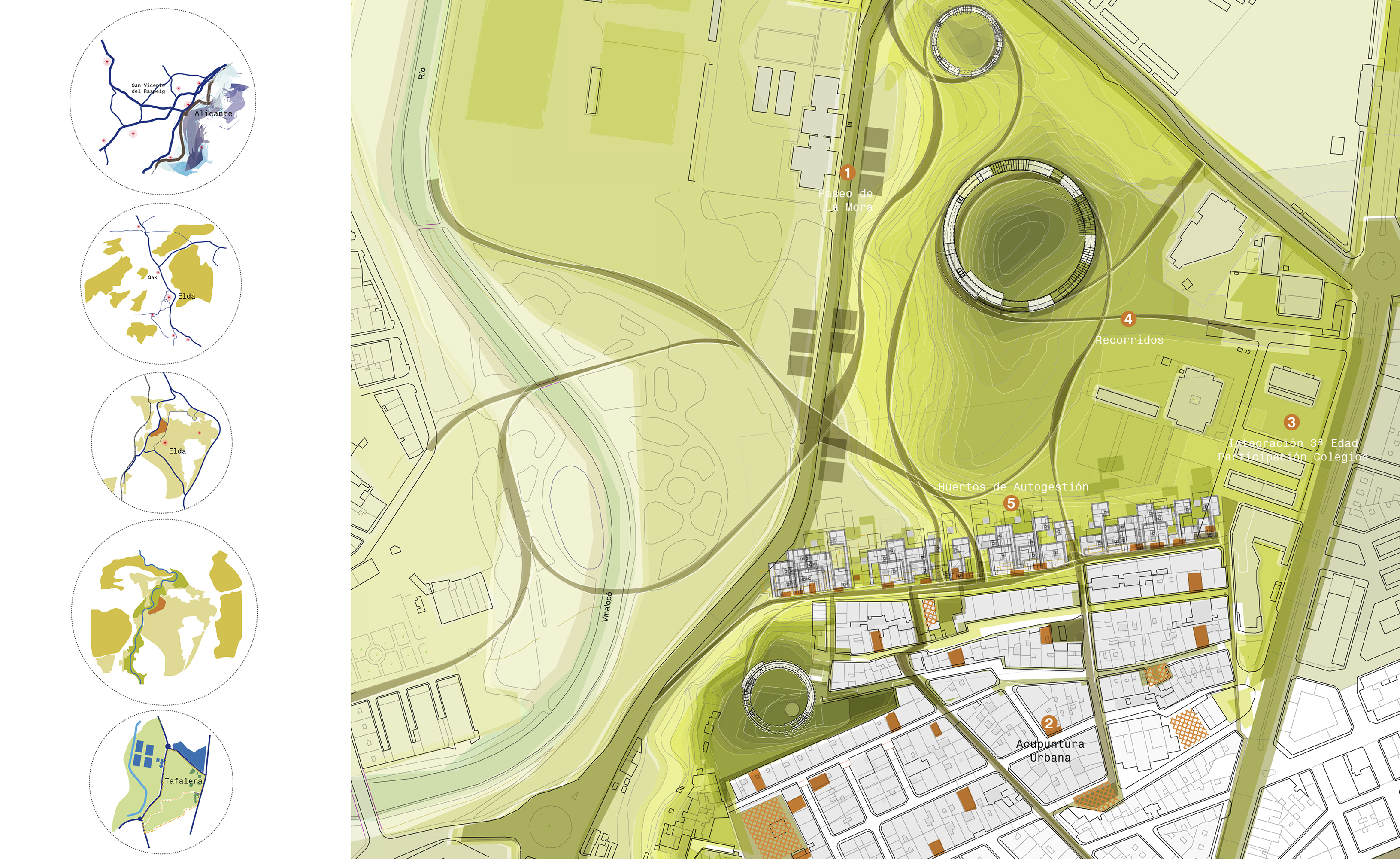 Nos encontramos con una topografía ondulada caracterizada por tres cimas: el alto de Tafalera, el alto de San Miguel y la colina donde se ubica el barrio de Numancia. Son hitos que queremos destacar. Integramos los primeros dos en los vacíos del entorno y acentuamos las cumbres, cada uno con un anillo, que se incorporan en el recorrido que conecta las diferentes zonas del cultivo con el barrio. La tercera colina, la de